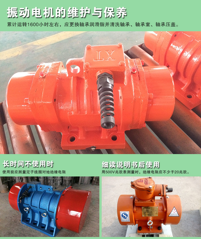 振動電機運轉過程中,必須注意軸承的潤滑。在正常工作條件下,累計運轉1600小時左右,應更換軸承潤滑脂并清洗軸承、軸承室、軸承壓蓋。