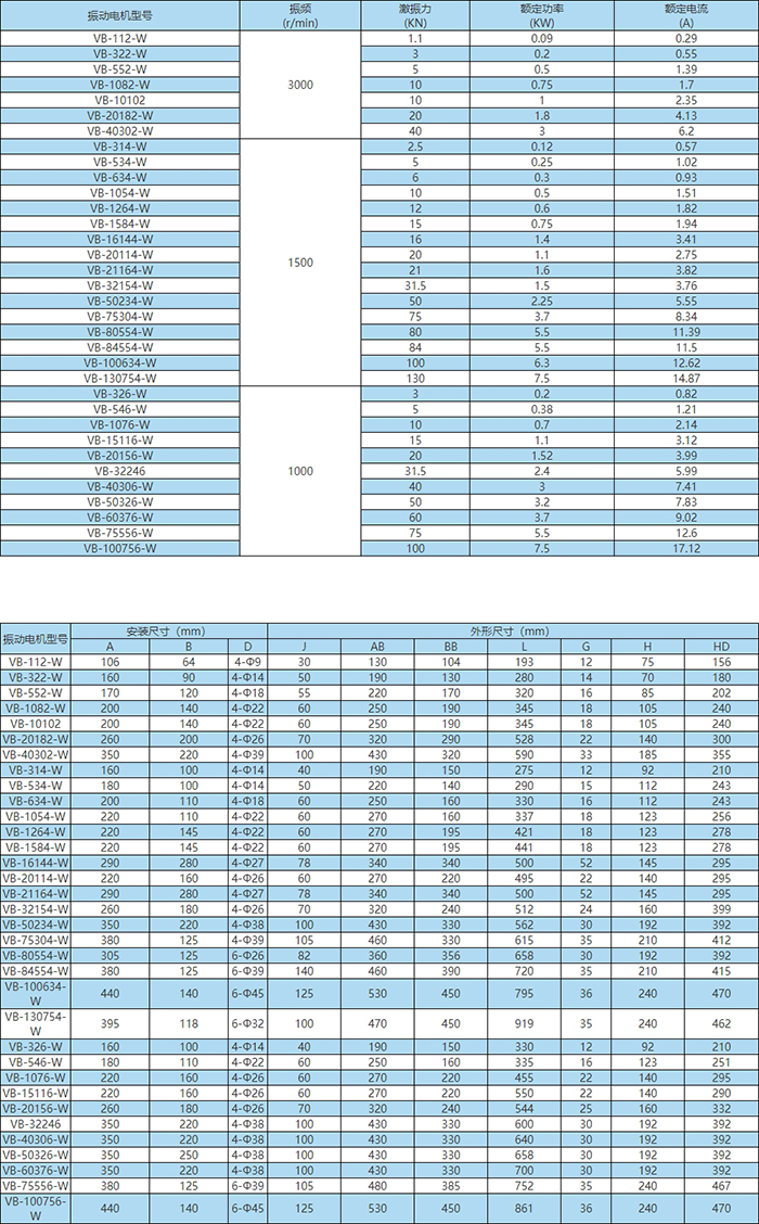 VB系列振動電機,功率范圍0.12~25KW,2、4、6、8極,激振力為2.5~300KN,共計五十余種規(guī)格型號。