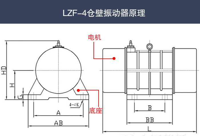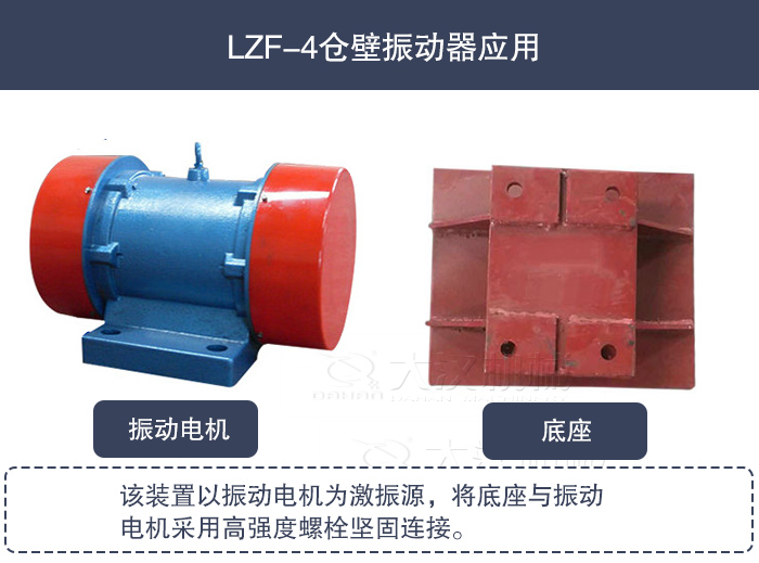 LZF-4倉壁振動器是應(yīng)用振動電機(jī)的一個典型實(shí)例。該裝置以振動電機(jī)為激振源,將底座與振動電機(jī)采用高強(qiáng)度螺栓堅(jiān)固連接。